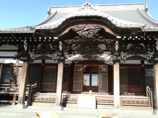 | 地下鉄千代田線千駄木駅から出発。三崎坂を上る。瑞輪寺本堂は垂木や木鼻の彫刻の色合いが印象的。 |