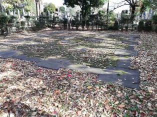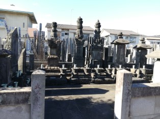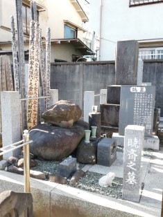 | 奥の方にはカエル型をした河鍋暁斎の墓。河鍋家の新しい墓誌には平成27年没の名が刻まれていた。 |