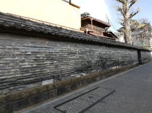 | 瑞輪寺から三崎坂に戻り、北上。観音寺の築地塀に突き当たる。 右に行くと谷中霊園方面。左に行くと蛍坂経由で宗林寺。 |