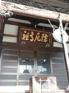 延命院本堂の左側に立つのが七面大明神のお堂。左手前の石に「七面」の文字が見える。 |