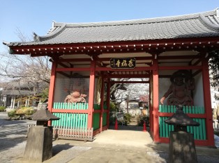 | 谷中には珍しい養福寺の仁王門。門の向こうに文人碑が見える。 |