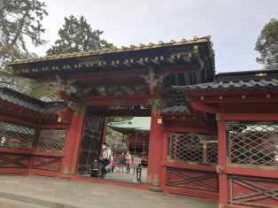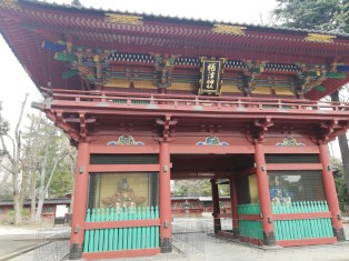 | 鳥居をくぐり、参道を進んで神橋を渡ると、根津神社楼門。 |