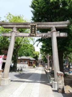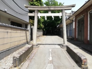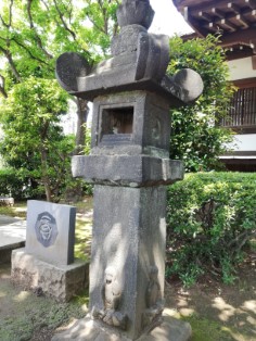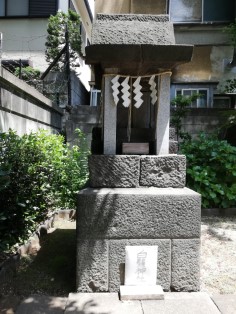 | 左側燈籠の下を見ると、お猿さんが。竿石の正面、左右に三猿が1匹づつ彫られている。燈籠型の庚申塔ははじめて見た。 | 与楽寺坂から童橋を経て、田端八幡神社へ。一の鳥居の手前にあるのは谷田川にかかっていた石の橋の一部。右側にはズラリと神輿庫が並んでいる。 |