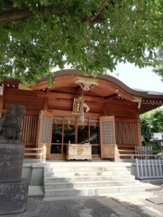 | こちらは上田端八幡神社。この神社そのものは名所図会には登場しない。奥の鳥居の左脇を上っていくと本殿の左側に移築された白鬚神社がある。 | 白鬚神社。おそらく下の石は載せるために作ったものだろう。手書きの神社名がなんともいえない。 |