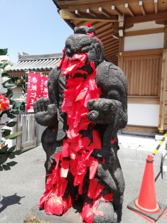 | まだ木の香も新しいような八幡神社。平成5年再建。 | 田端八幡神社の隣は東覚寺。赤紙を仁王に貼り付けるのは明治以降の風習。 |