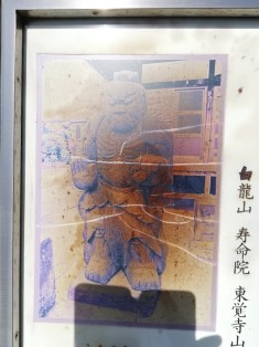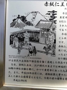 | 赤紙を貼り付ける風習の前の仁王さまはこんな感じ。写真が焼けていてよく分からないが、別の仁王さまのようだ。 | 仁王さまは閉ざされた田端八幡宮の門前に立っていた。 慶応2年頃の石造り金剛力士像の様子(出典『御府内八十八ヶ所道しるべ』)とある。 |