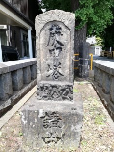 | 8月5日は白鬚神社の大祭とある。移築されたこの地にすっかり根付いているようだ。 | 上田端八幡神社を右に出て真っすぐ行くと JR線路に突き当たる。円勝寺は踏切を渡ってすぐ右側で線路沿いになる。参道入口にある庚申塔。 |