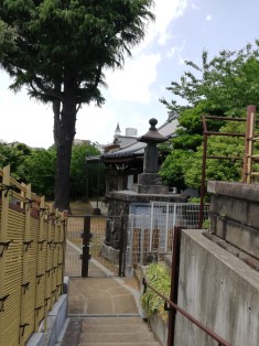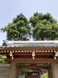 | 庚申塔の後ろにある石柱。厄除大勢至菩薩霊場と読める。図会の挿絵にある勢至堂のことであろう。 | 山門向こうに巨大なヒマラヤ杉が2本。 この寺に伝わる家康ゆかりの松の代わりか? |