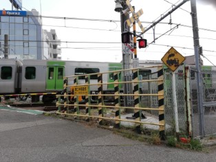 駒込駅に向かう山手線。円勝寺山門を出てそのまま線路沿いを行くと駒込駅。第二中里踏切は唯一山手線を見られる踏切。 |